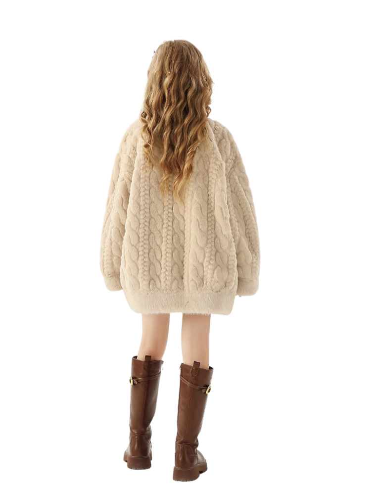 这款米白色毛绒外套采用柔软仿皮草材质,保暖又舒适,轻松演绎甜美与复古相结合的时尚感。
