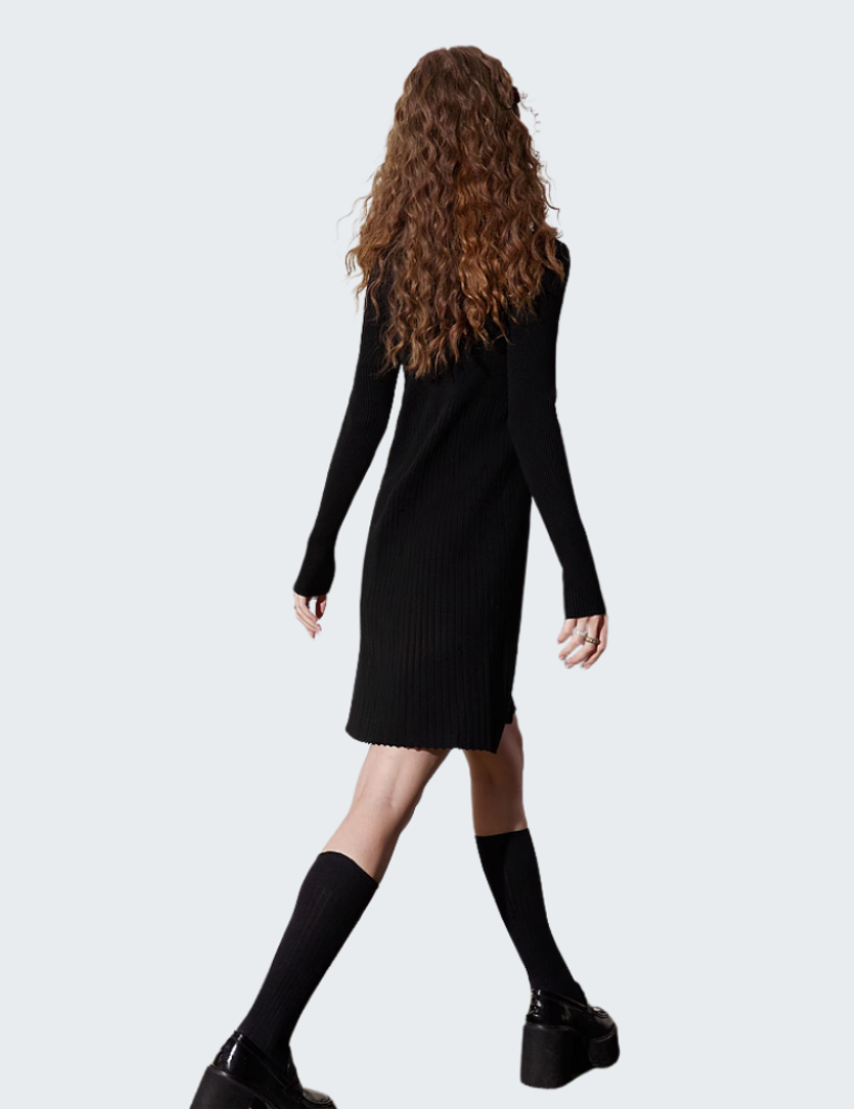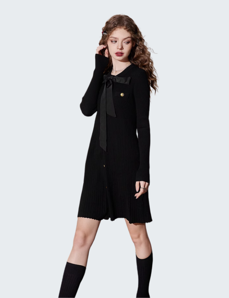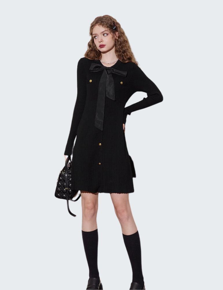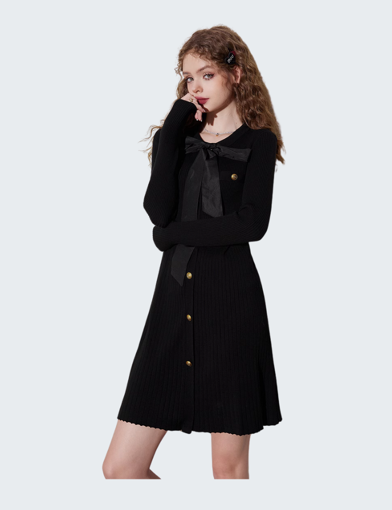 这款黑色针织连衣裙以柔软亲肤的针织面料为基础,既保暖又舒适。整体采用细密的竖条纹编织手法,勾勒出修长身形;胸前别致的蝴蝶结设计增添了甜美优雅的气质;金色纽扣装饰从领口一直延伸至裙摆,不仅增添了视觉亮点,也让整体更显高级质感。长袖与过膝长度的巧妙结合,既能在微凉的季节里保持温暖,又能在正式场合展现端庄与大方。无论是日常通勤,还是约会聚会,这条针织连衣裙都能为你带来恰到好处的时髦与气质。