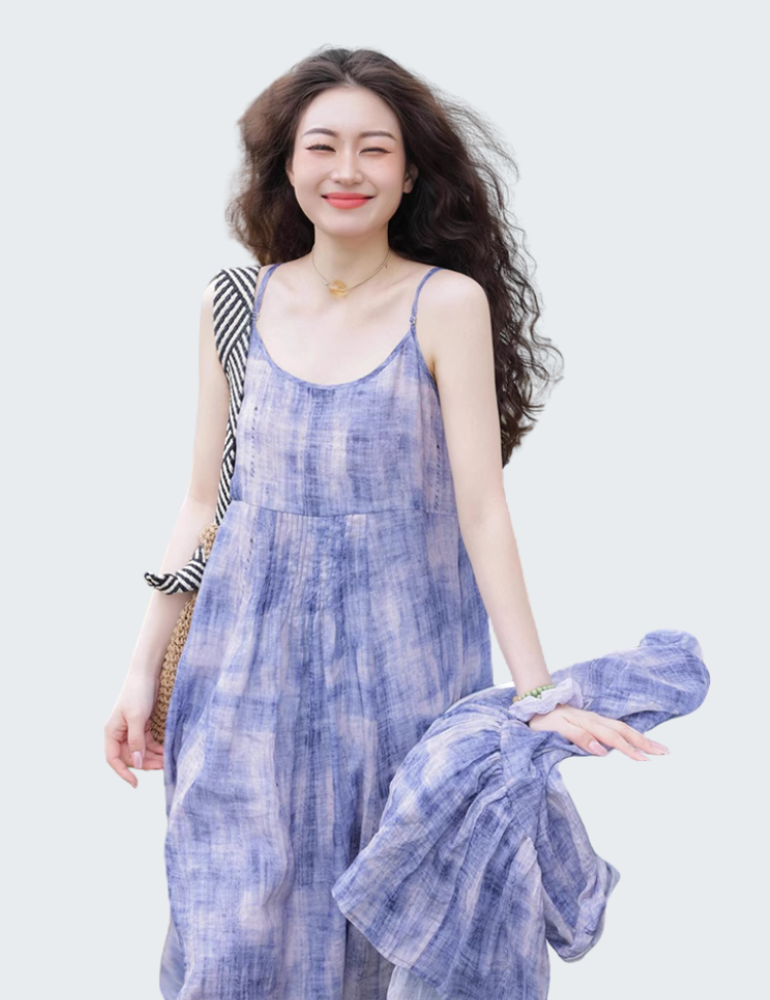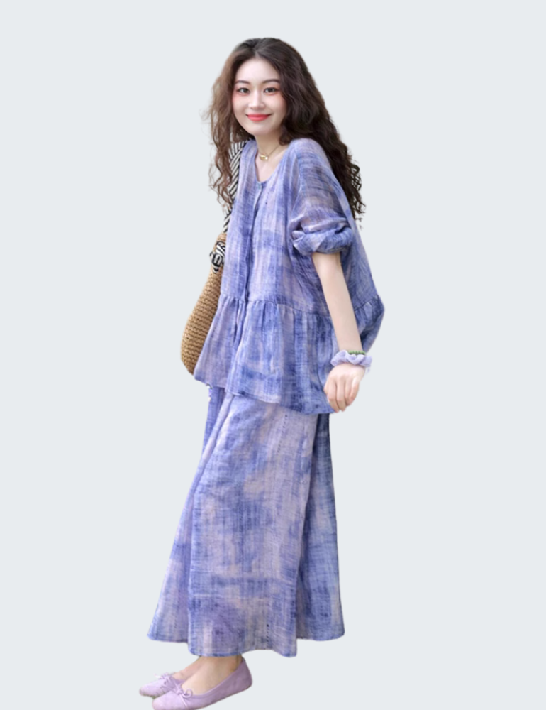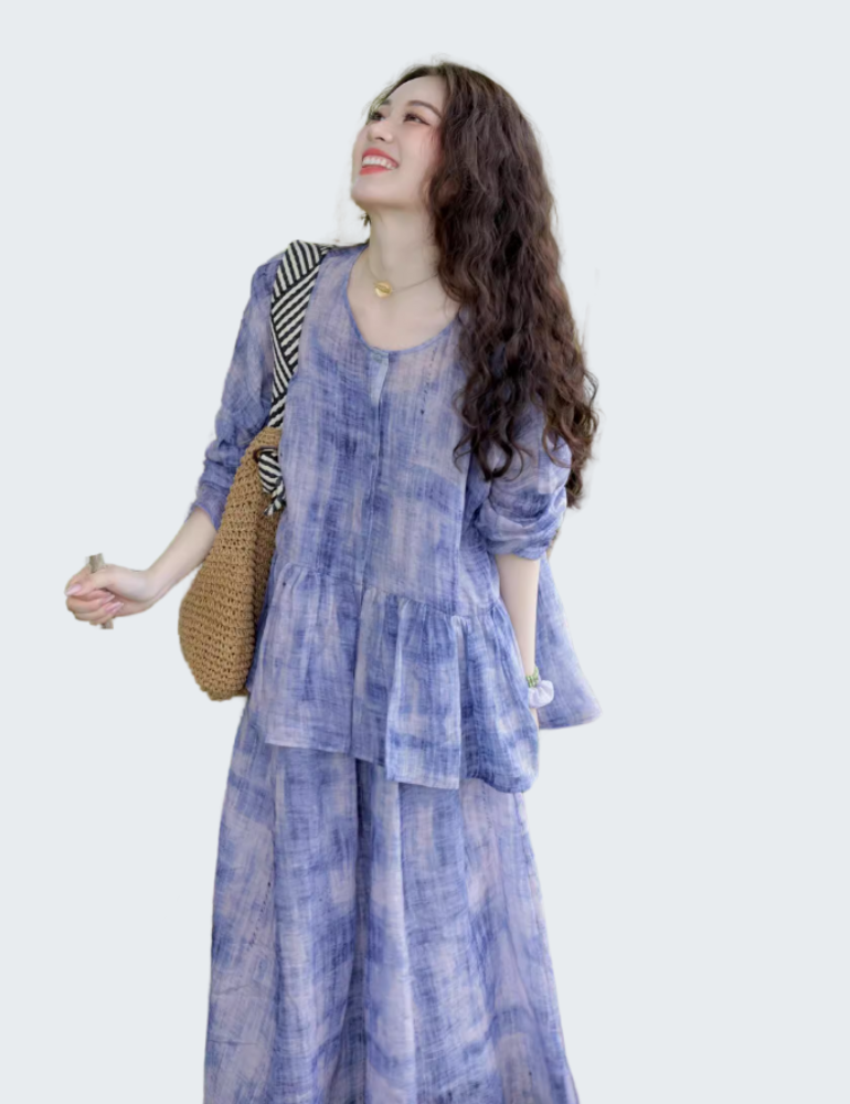 这款两件套由清爽的棉麻质地打造,整体以蓝紫色的水洗晕染效果为主调,散发出淡雅文艺的气息。上衣采用圆领设计,前襟轻便开合,并在腰部拼接出自然的荷叶边,不仅增添层次感,也能巧妙修饰身形;下装为宽松的长裙版型,与上衣的同款面料相呼应,整体视觉柔和统一。面料透气舒适,适合春夏及初秋穿着,搭配草编包或简单凉鞋即可轻松打造惬意的度假风或日常休闲装扮,让你在忙碌的都市生活中尽显随性与舒适。