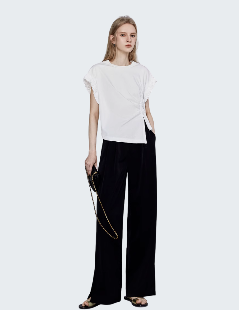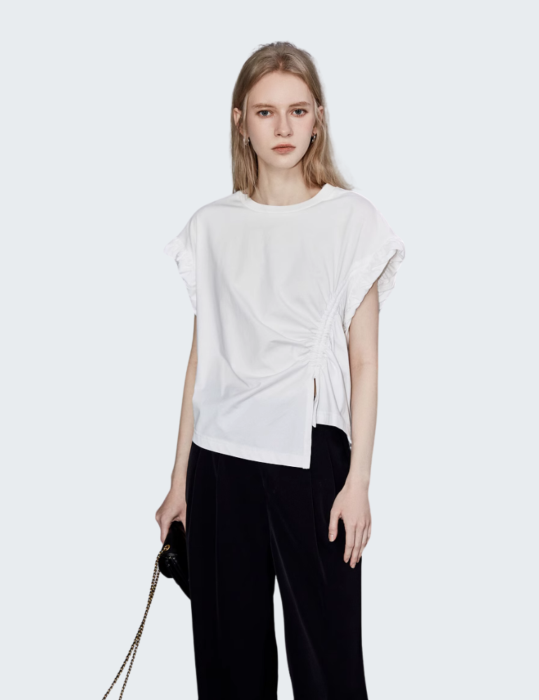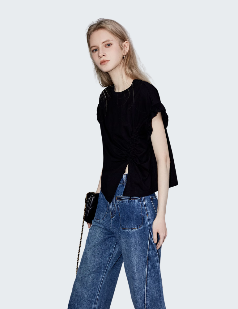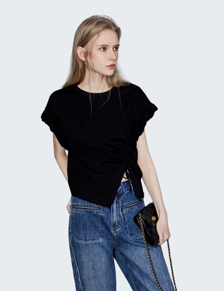 这款短袖上衣提供黑色和白色两种选择,采用柔软亲肤的面料,圆领设计简洁百搭。袖口与侧身褶皱细节为整体增添层次感,微微蓬起的袖口不仅修饰肩部线条,也带来灵动俏皮的视觉效果。下摆侧开衩搭配褶皱抽绳式设计,既能自由调节松紧度,又为日常穿搭增添时尚看点。无论搭配牛仔裤还是阔腿裤,都能轻松打造休闲又富有设计感的造型。