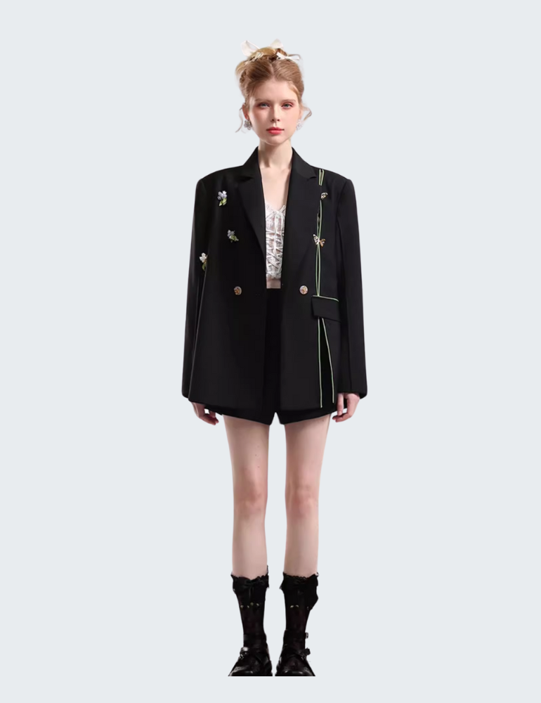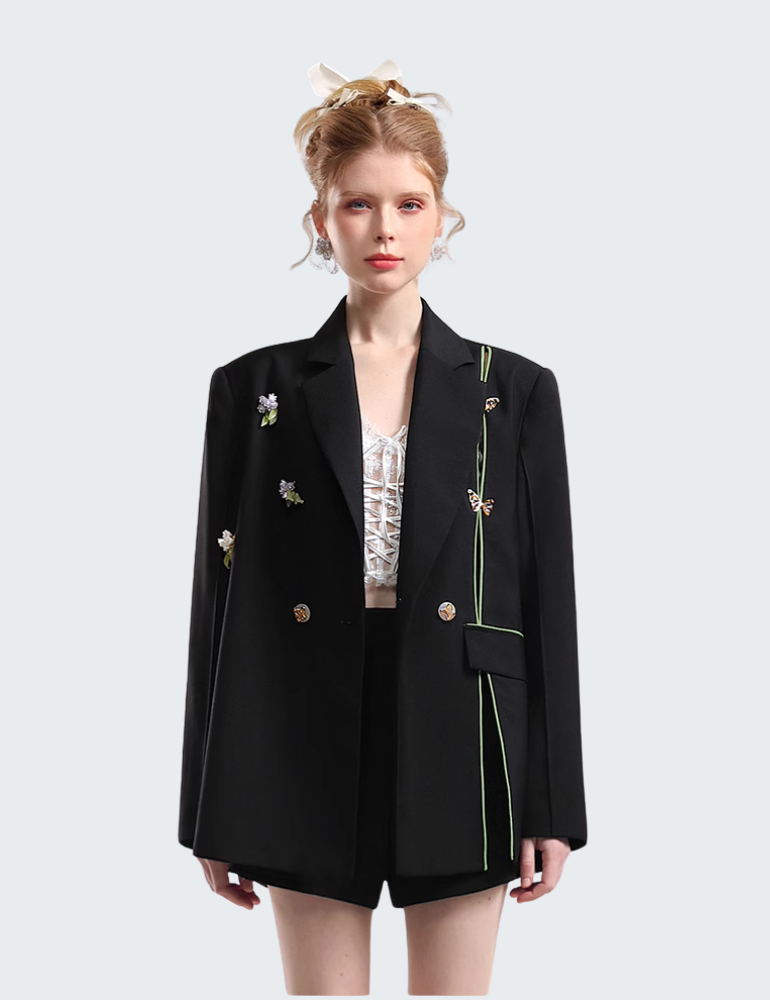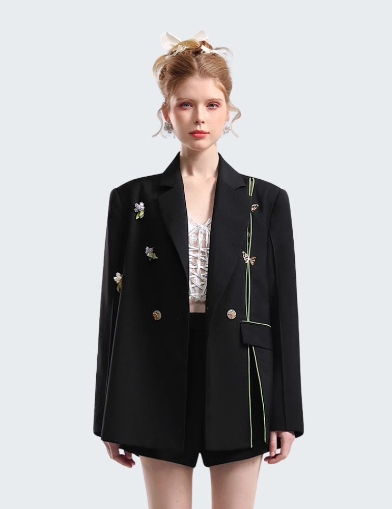 这款黑色西装外套打破常规,巧妙融合了利落剪裁与精致刺绣元素,整体呈现低调却不失亮点的风格。胸口与侧身点缀多处立体花卉与蝴蝶刺绣,细腻精巧,尽显浪漫法式气息;单侧绿色线条贯穿,从肩部延伸至口袋位置,打造出富有设计感的立体视觉效果。