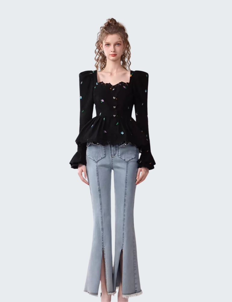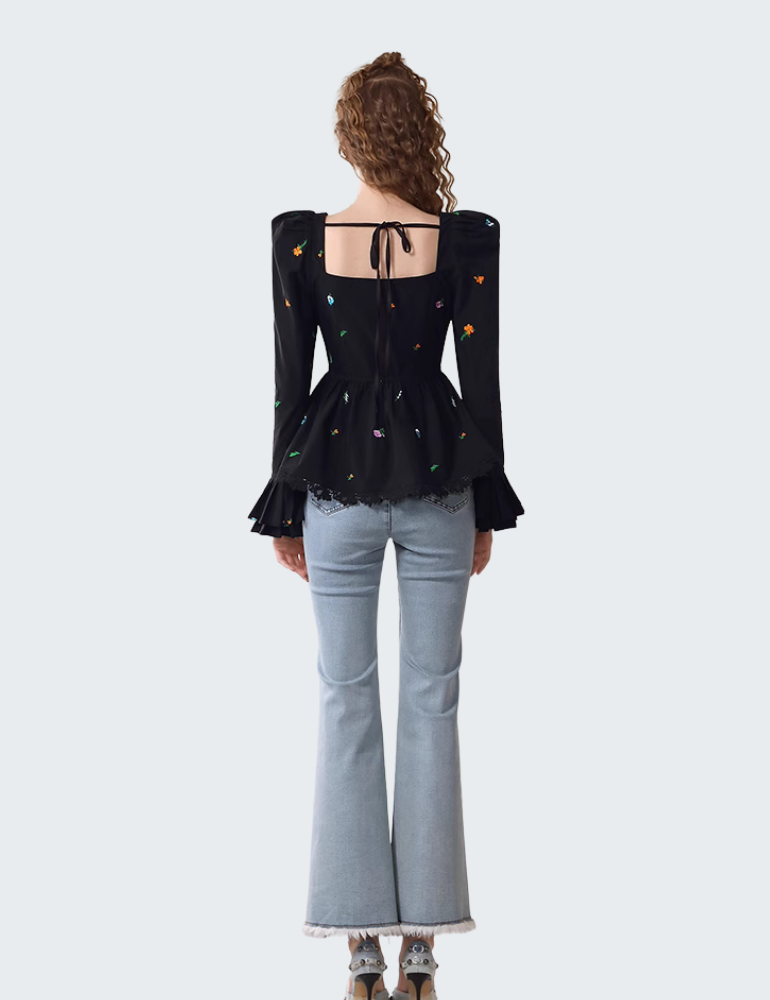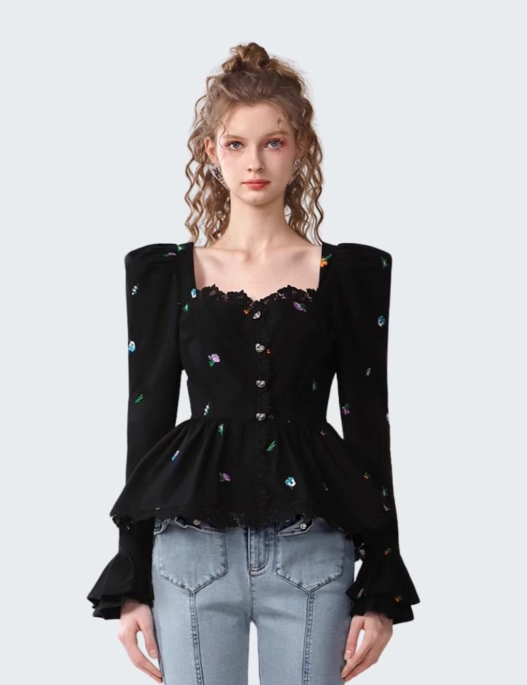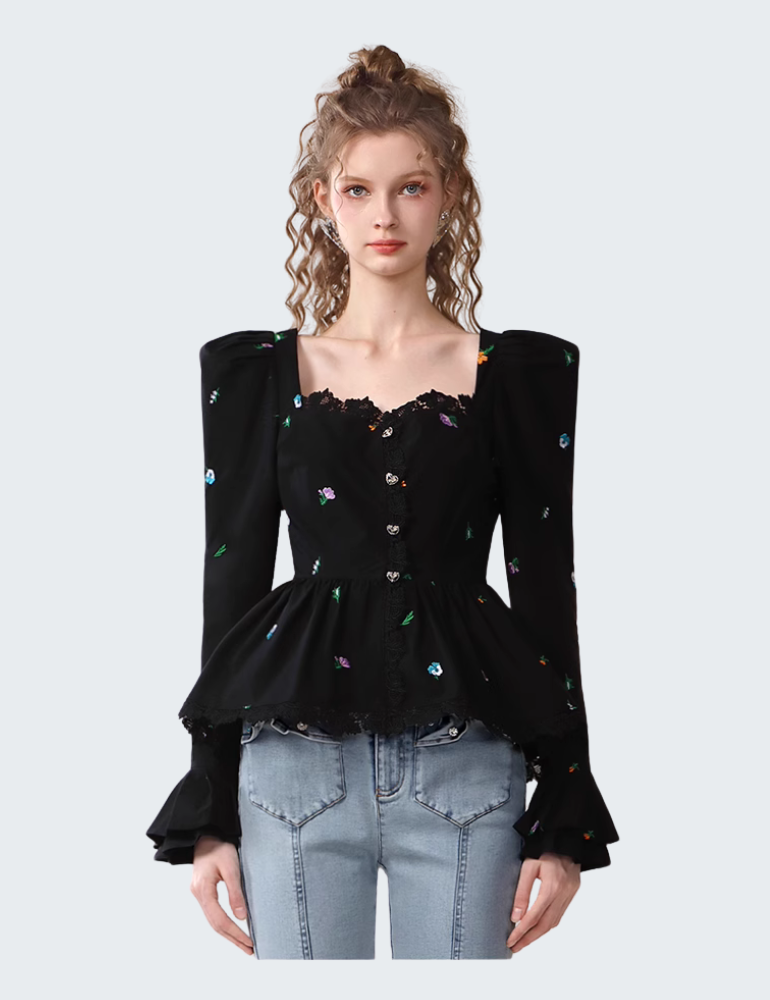 这款黑色刺绣上衣采用浪漫复古风格设计,方形领口搭配蕾丝边缘,尽显精致与优雅。肩部采用立体剪裁的泡泡袖造型,袖口荷叶边设计增添灵动与层次感。衣身散布多彩小花刺绣,彰显活泼与甜美气息。腰部收褶搭配微蓬的下摆,不仅勾勒纤细腰线,也让整体更具层次。前排扣设计结合蕾丝装饰,既实用又增添法式浪漫风情,适合在派对、约会或日常场合展现独特魅力。