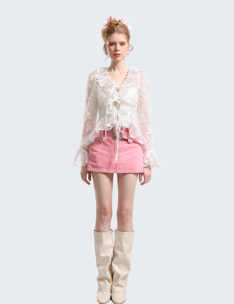 这款白色蕾丝上衣采用半透明刺绣面料,花卉图案点缀整体,带来浪漫唯美的视觉效果。V领搭配荷叶边设计,前襟配有细长系带,不仅能根据需求自由调节,也增添了精致感与层次感。袖口与下摆的荷叶边呼应整体风格,令穿着更显轻盈飘逸。无论搭配牛仔短裙还是高腰裤,都能轻松打造甜美又不失时髦的造型。