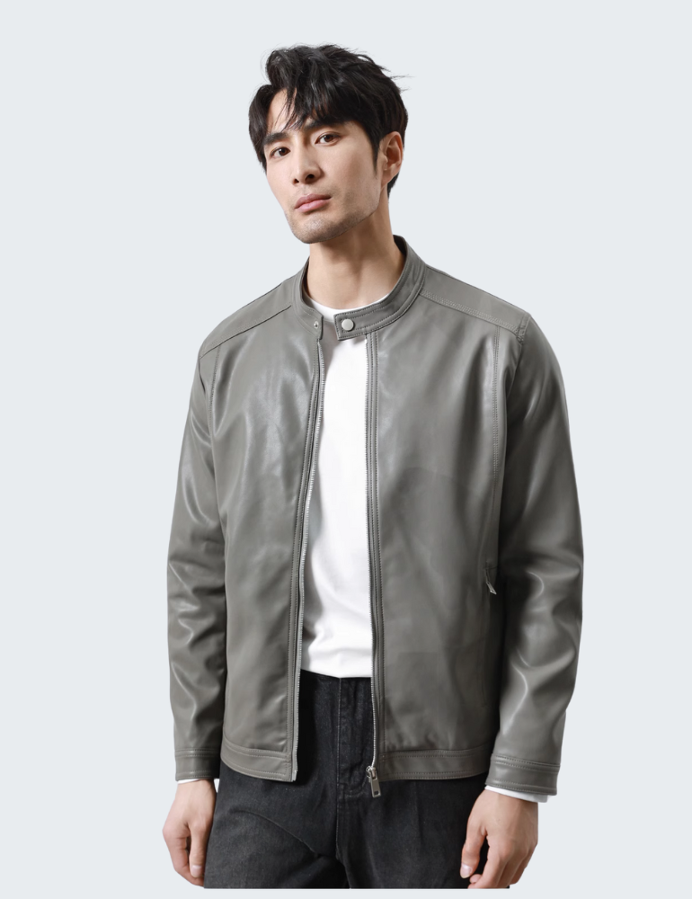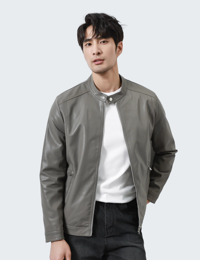 This PU leather jacket comes in sleek black and grey. It features a stand-up collar with snap-button details, a secure front zipper, and zippered side pockets. Crafted from high-quality synthetic leather, it offers wind resistance and easy care. Its slim fit contours the body, making it a stylish choice for any urban wardrobe.
