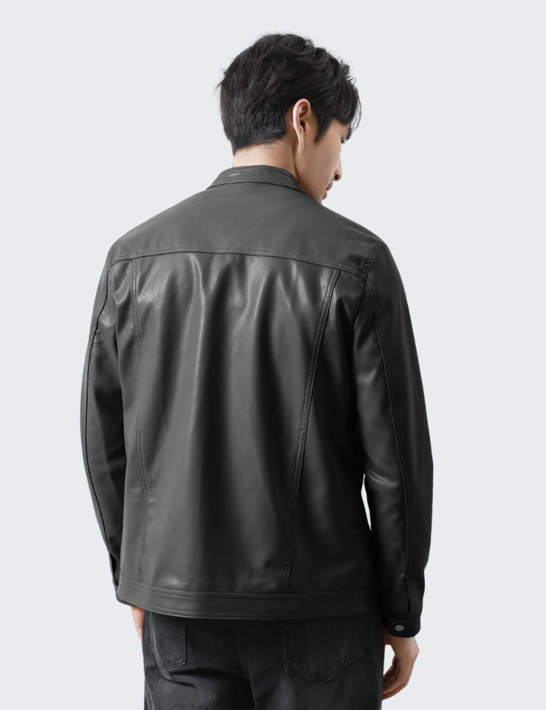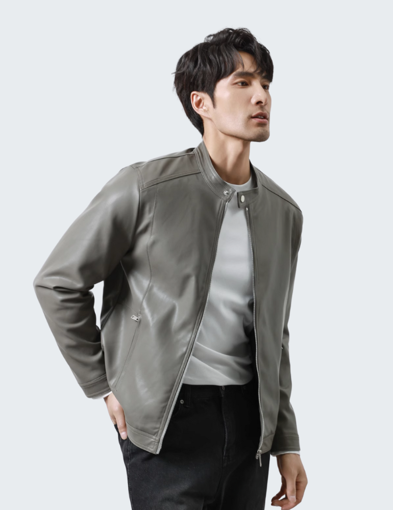 This PU leather jacket comes in sleek black and grey. It features a stand-up collar with snap-button details for a modern, urban look. Made from high-quality synthetic leather, it offers wind resistance and easy maintenance. A secure front zipper and zippered side pockets add style and function. Its slim fit contours your figure, making it ideal for pairing with jeans or casual trousers—a must-have for any contemporary wardrobe.