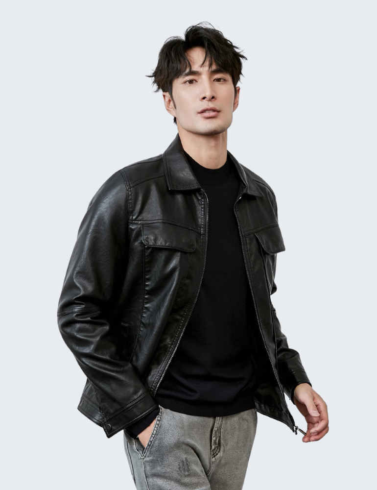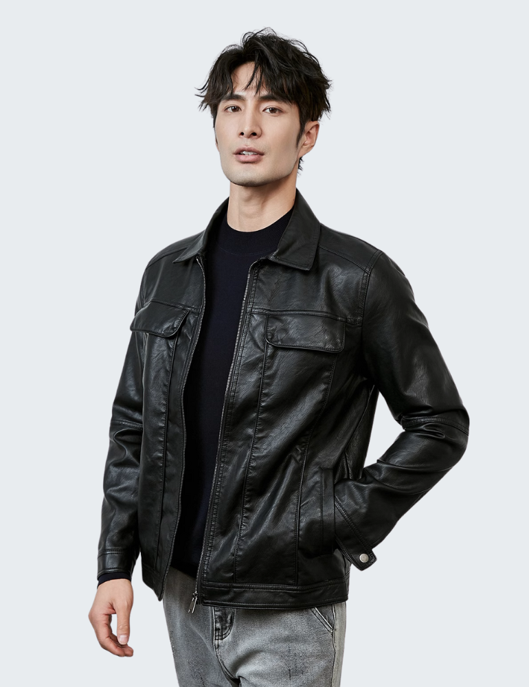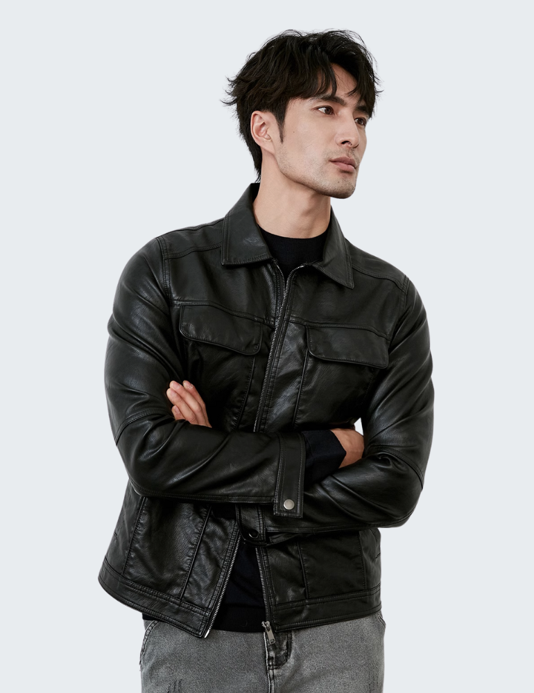 Elevate your style with this sleek black faux leather jacket. Designed with a modern cut, it features chest flap pockets, a zip front, and a smooth finish for a timeless look. Perfect for casual outings or urban nights, it adds instant edge to any outfit.