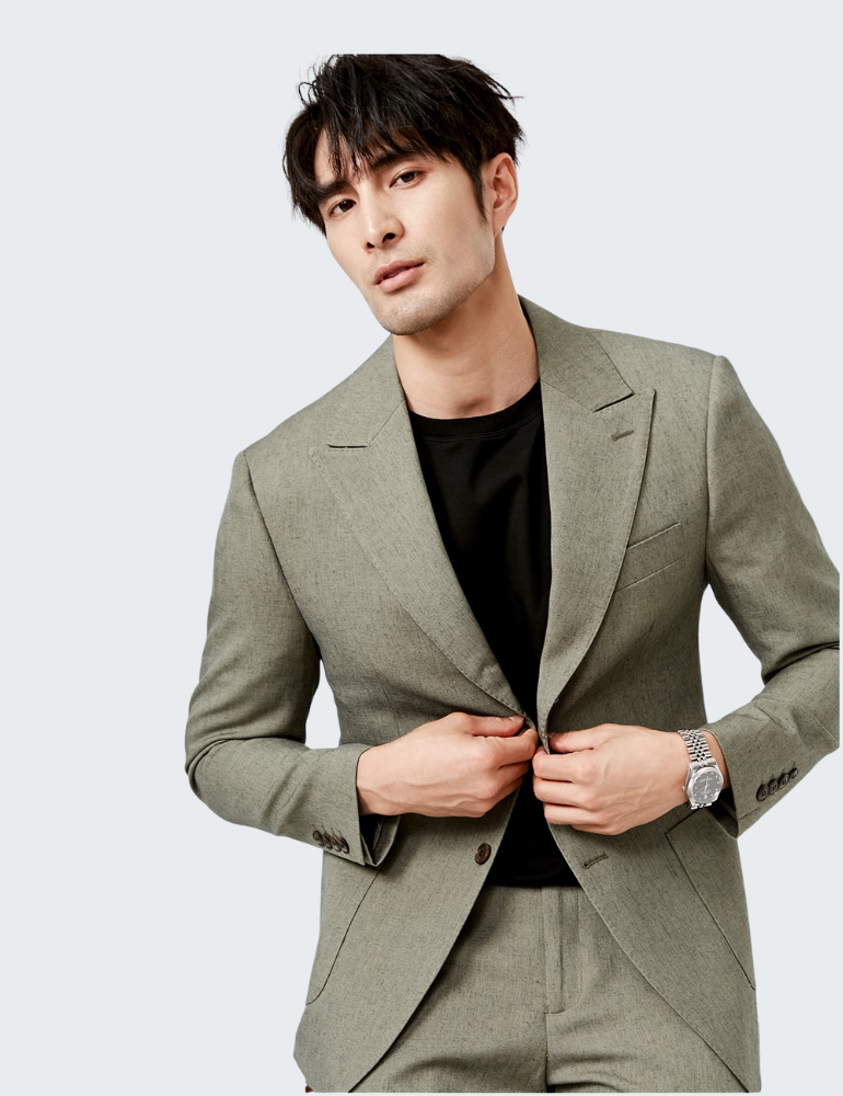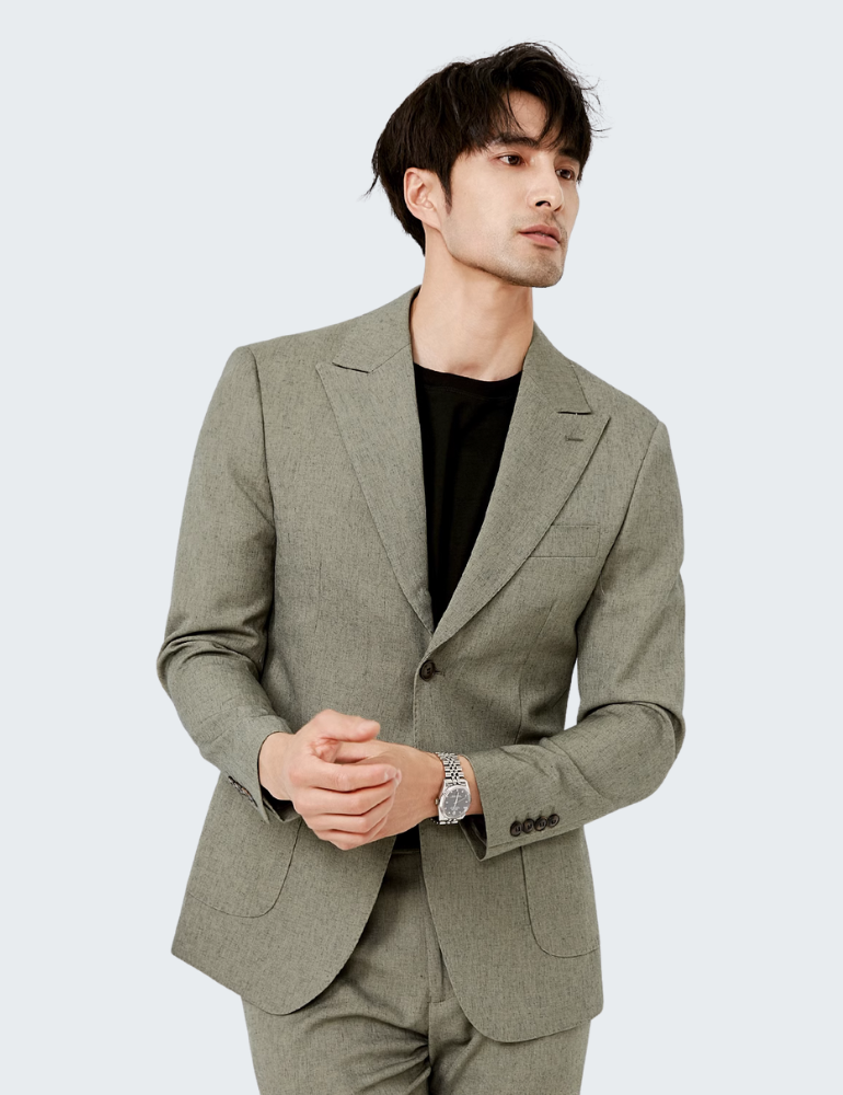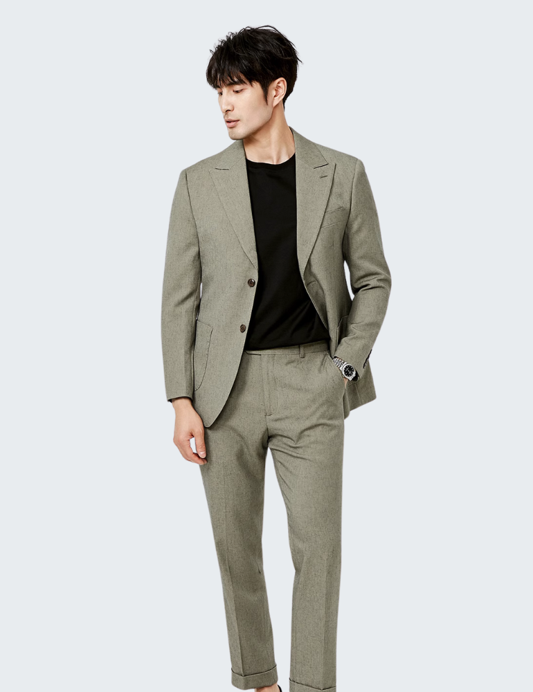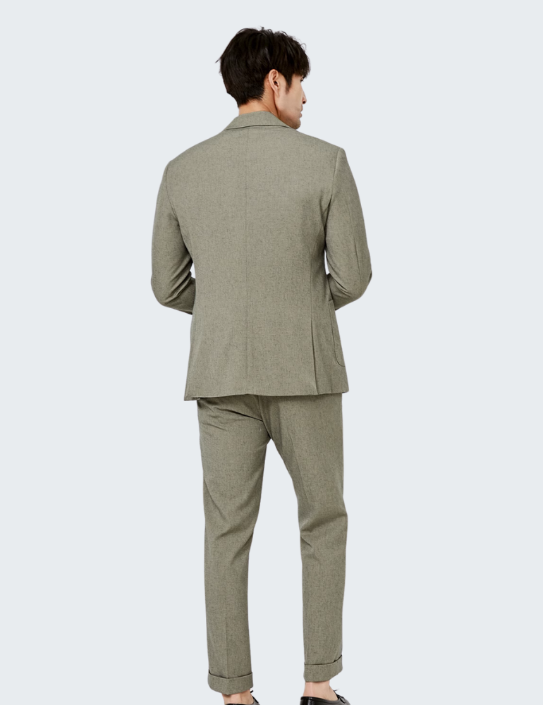Step into effortless sophistication with this modern slim-fit two-piece suit. Tailored in a soft, textured fabric with natural stretch, it features a sharp notch lapel blazer and streamlined trousers that offer comfort and polish. The subtle olive-gray tone pairs seamlessly with shirts or tees for both business and casual style. Clean lines and a refined silhouette make this set a versatile wardrobe essential for the contemporary gentleman.