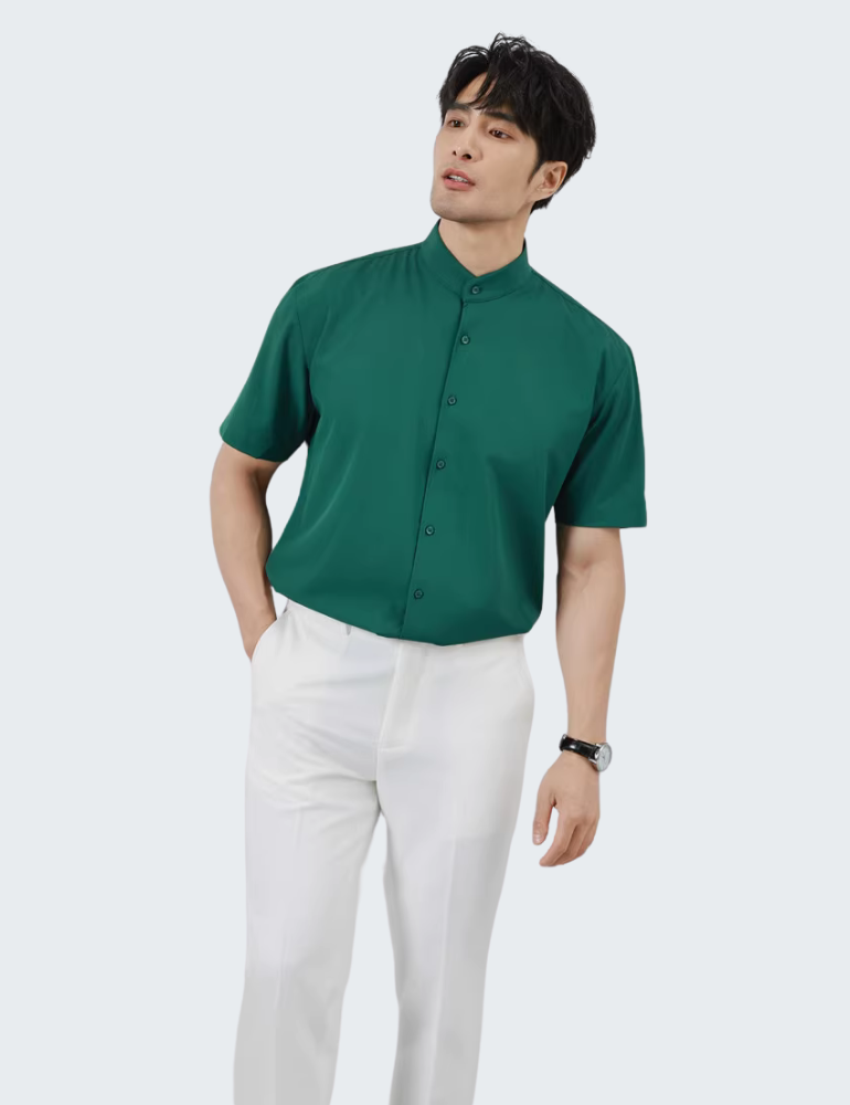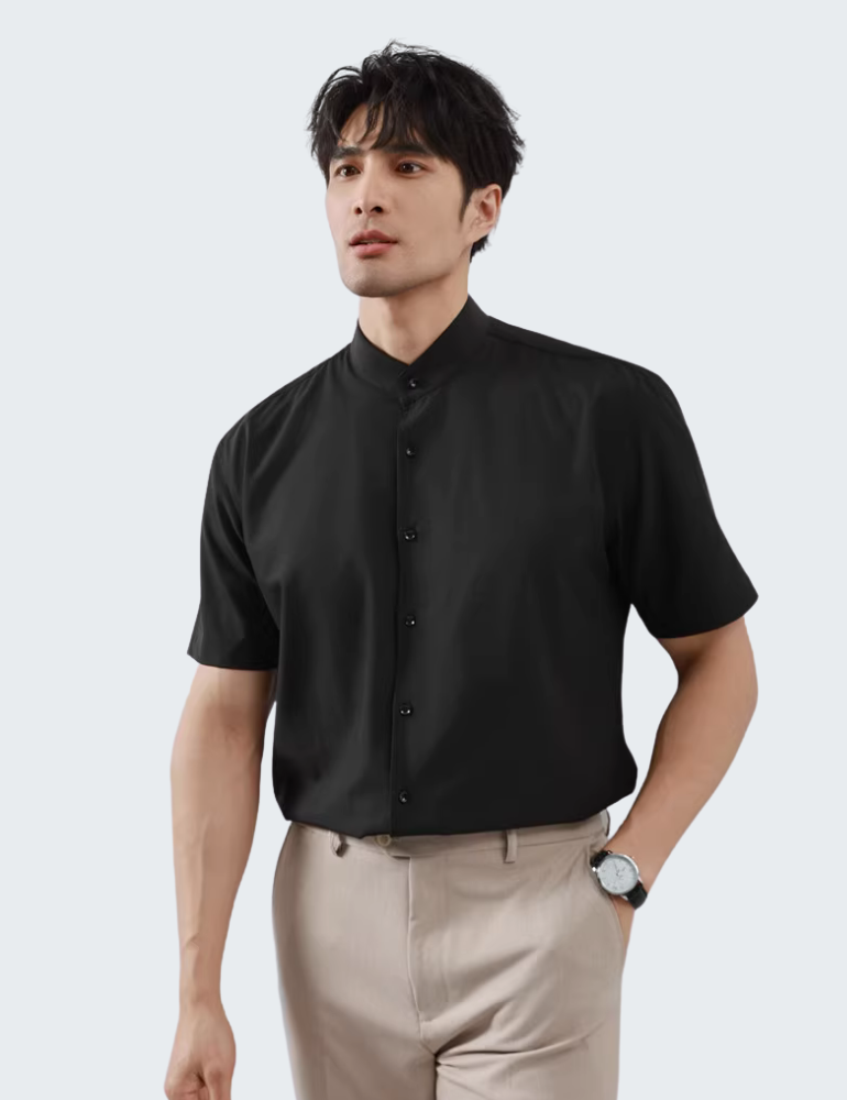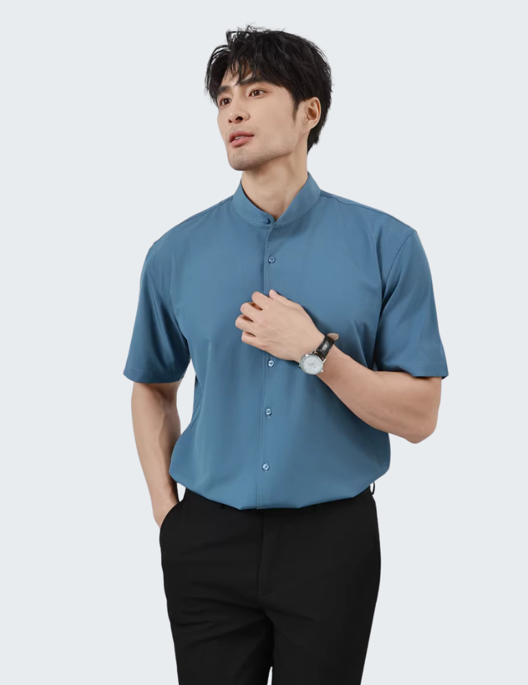 本款衬衫选用高比例聚酯纤维混氨纶弹力面料,既具备聚酯纤维的挺括、耐磨、速干等优点,又融合氨纶所带来的舒适弹性,穿着轻盈贴合、不紧绷、不束缚。布料表面细腻清爽,不易褶皱,易打理,日常穿着与通勤皆宜。透气性佳,夏季穿着也能保持干爽舒适,兼顾都市感与实穿性。