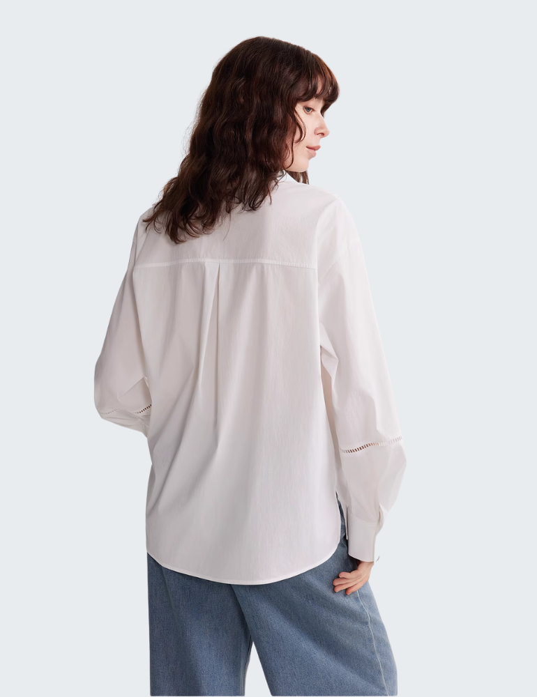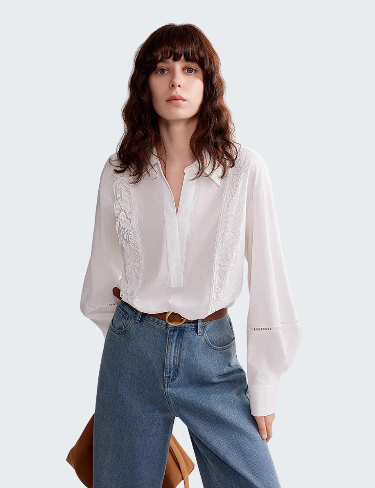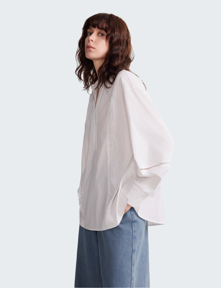 这款白色衬衫采用极简法式设计,融合复古与优雅气质,呈现出知性温柔的女性魅力。胸前精美蕾丝镂空拼接,细节满满,提升整体精致度;微立领V字领口设计,修饰脸型,延伸颈部线条,尽显干练与柔和并存的气质。